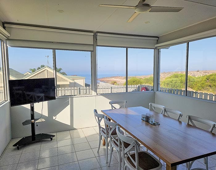 A double work desk leads to an air-conditioned sunroom with ocean views.