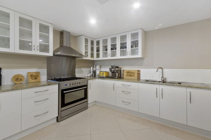“The designer kitchen, in the heart of the home features a large electric oven, gas cooktop, commercial dishwasher, and ample bench space — ideal for family meals or entertaining in style.