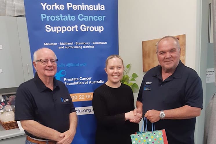 THANK YOU... Robert Kidd and Tony Hughes (right) thank Eliza Taheny for her presentation to the YP Prostate Cancer Support Group.