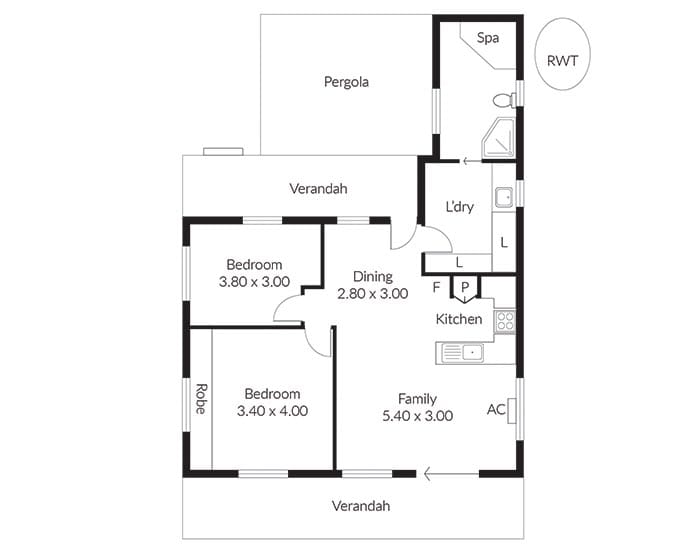 The home offers two light-filled bedrooms, a central bathroom with a corner spa, and an open-plan living area that makes the most of the natural light.