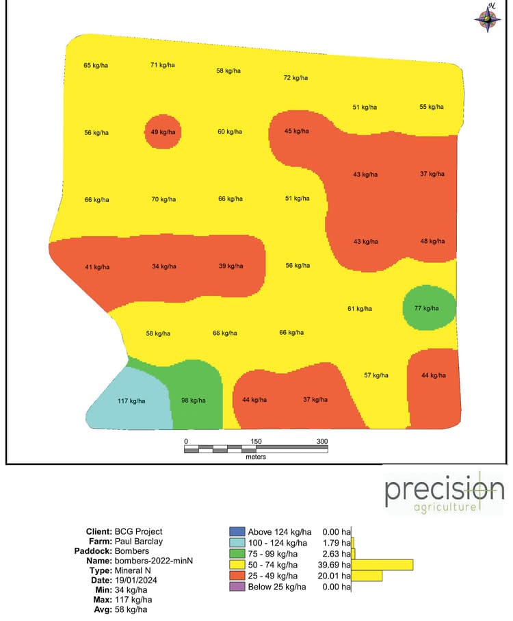 “An example from one paddock was soil sampled on a two hectare or 2ha grid highlights the kind of intra-paddock variability typically observed, with mineral N varying from 34-117 kg/ha in 2022 and 62-136 kg/ha in 2023.
