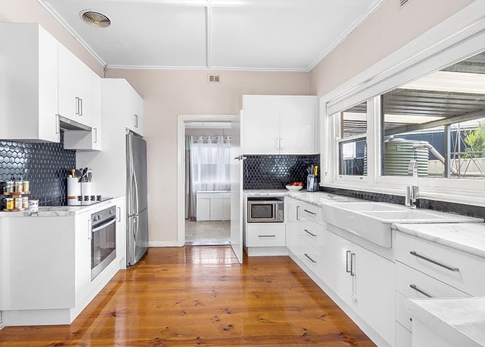 The lounge, dining room and kitchen all display timber flooring, and the kitchen is furnished with new appliances and a pantry.