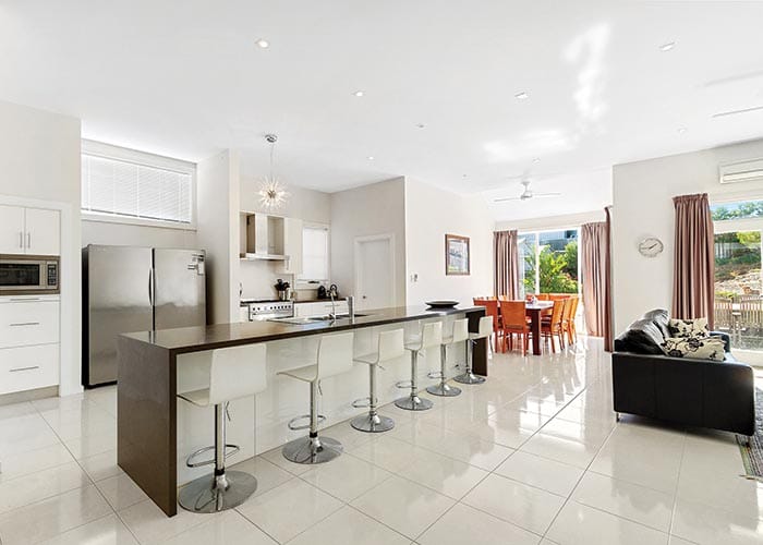 “The open plan kitchen area offers a huge island bench with ample storage and a dishwasher, six-burner gas cooktop and commercial-sized oven for whipping up lots of delicious spreads.
