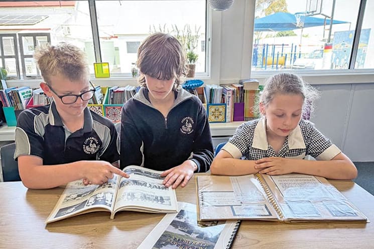 LOOKING BACK... Reuben Pedler, Eli Camp and Esta Fleming browse through documents from Curramulka Primary School’s archives.