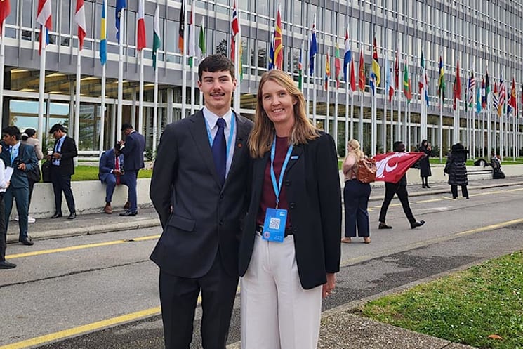 GENEVA... Rhys Heinrich and his mum, Linda Heinrich, outside the World Health Organization headquarters in Geneva.