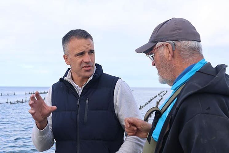 MAKING A SPLASH... Premier Peter Malinauskas with oyster grower Steve Bowley at the Stansbury harvesting area in July, when the first round of fishing and aquaculture support grants were announced. PHOTO: Sarah Herrmann