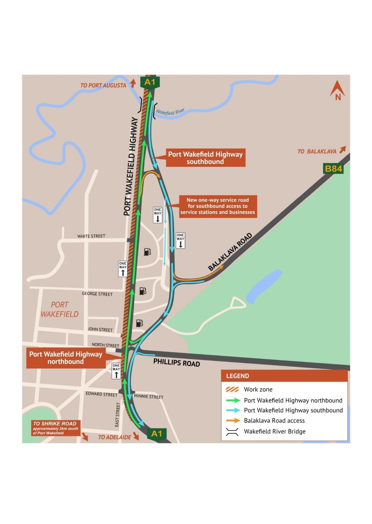 Southbound traffic (towards Adelaide) -- two lanes will be open to traffic from south of the Wakefield River Bridge to Shrike Road to help reduce delays, as much as practically possible. Southbound traffic will need to use the new, recently opened one-way southbound road east of the service stations.