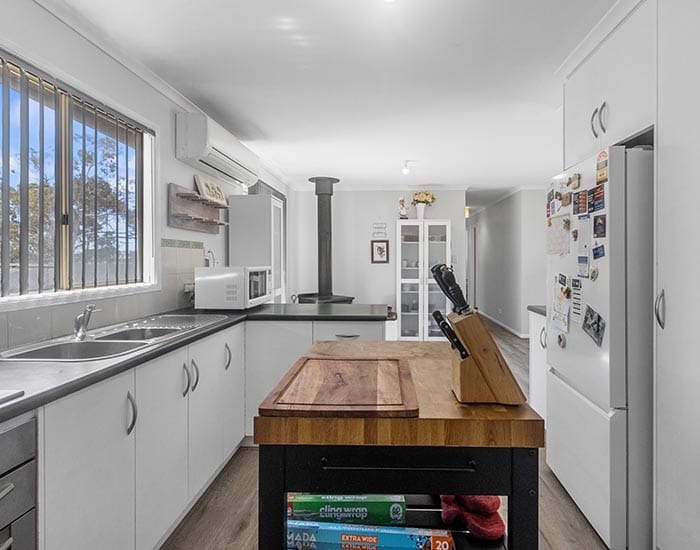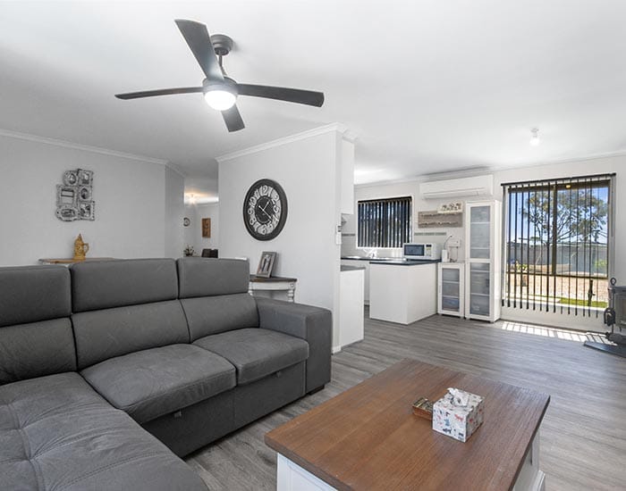 The home features a welcoming open-plan kitchen and dining area with split-system air conditioning, a ceiling fan and a combustion heater to ensure year-round comfort.