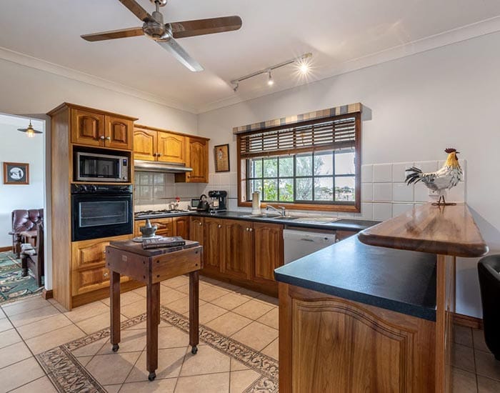 The homestead features a large open-plan living and dining area with combustion heating and ducted evaporative cooling.