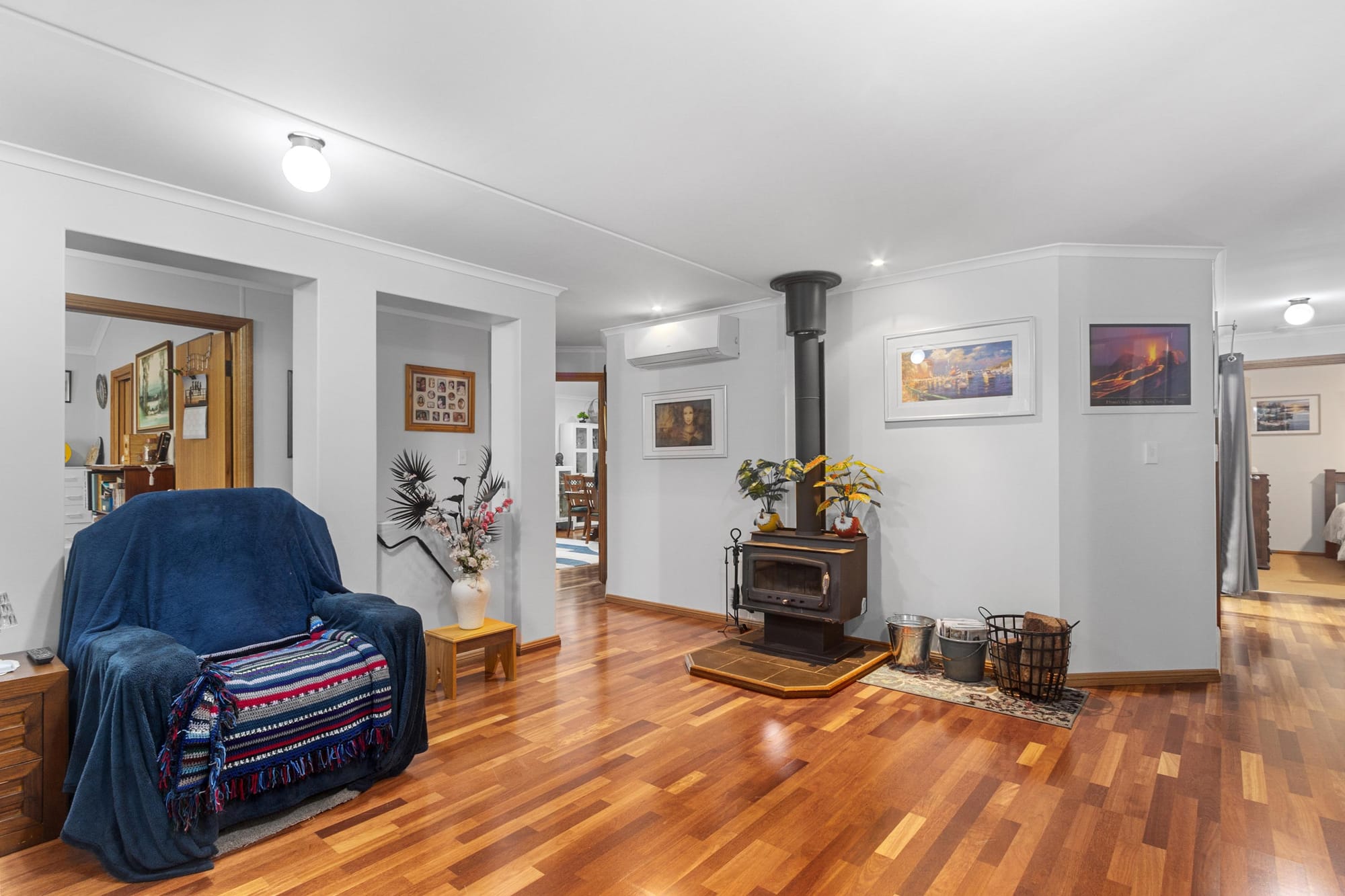 It flows seamlessly into the open-plan living and dining areas — kept at a comfortable temperature year-round with ducted evaporative cooling, two split-system air conditioners, and a cosy combustion fireplace.