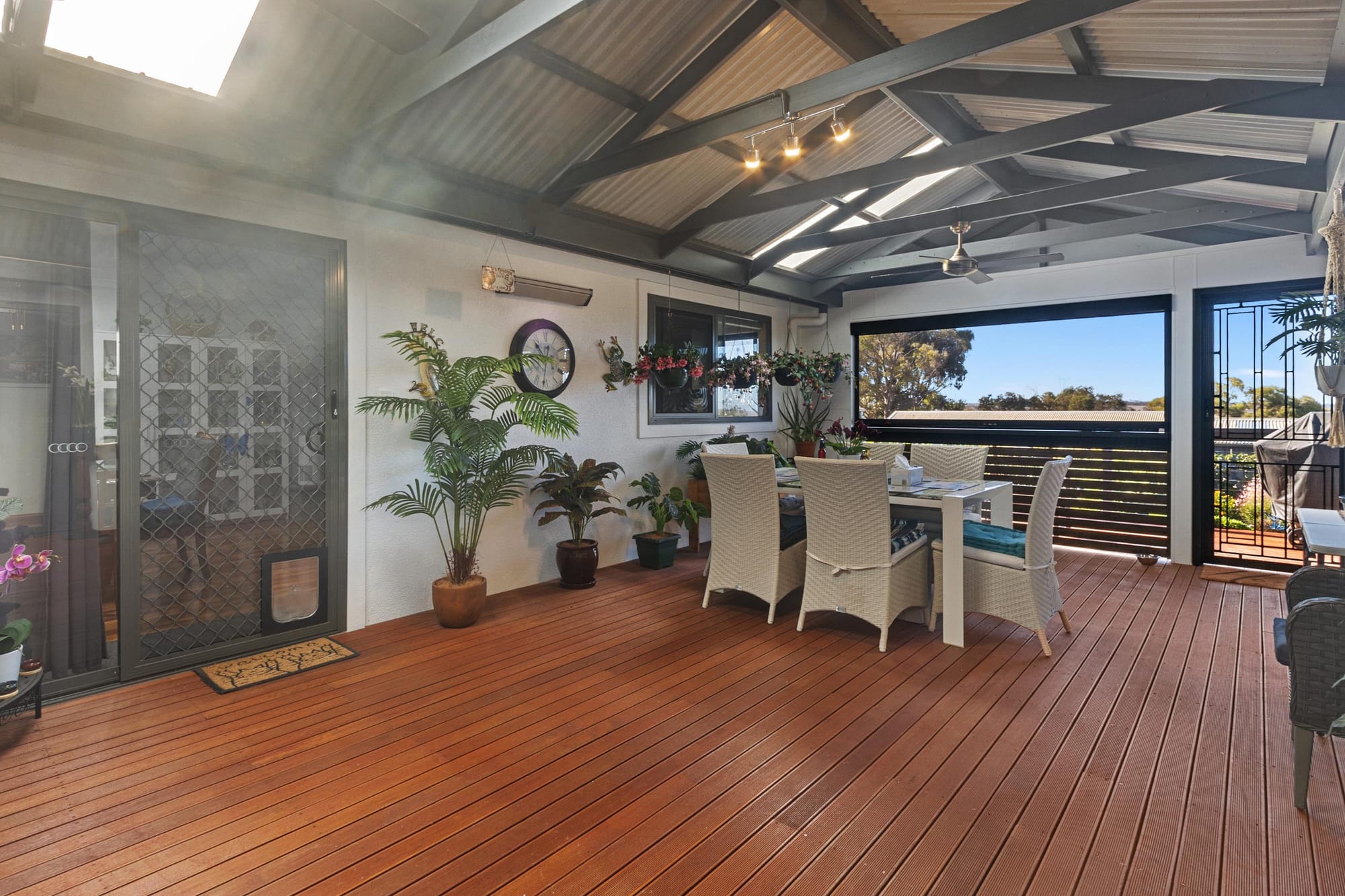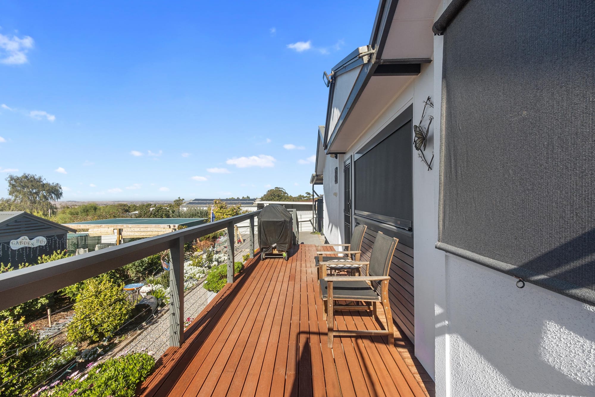 Outside, a large decked entertaining area with a built-in bar offers elevated views over the landscaped gardens — perfect for hosting guests or enjoying quiet afternoons.