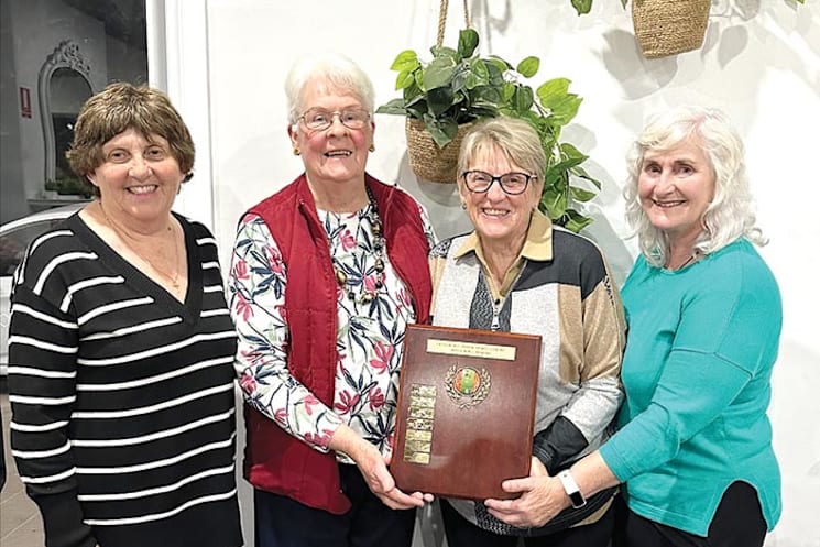 CUSH BOWLS PREMIERS... Club president Kaylene Osborn presents the premiership trophy to the winning team, Rubies: Pauline Sweet, captain Christine Nicholas, Vicki Clarke.