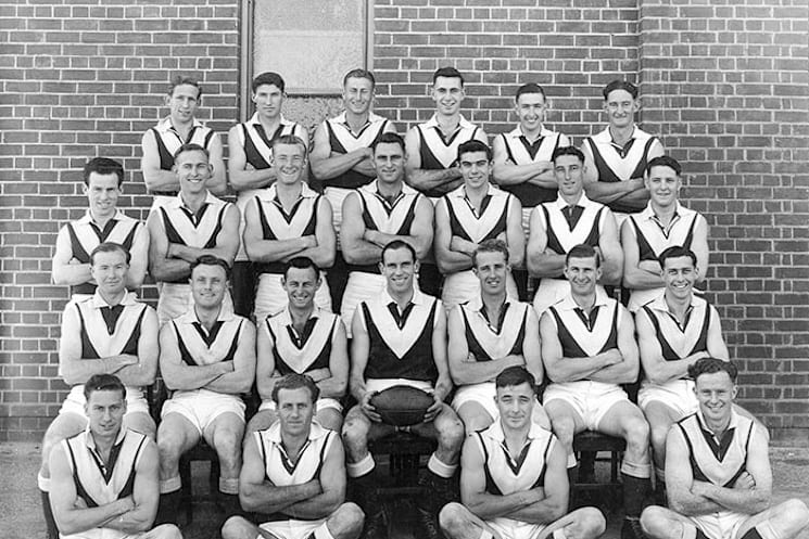 SANFL... North Adelaide Football Club’s 1949 premiership team, Morrie Arbon sits cross legged, second from right. Back: P Kennett, L Tuckey, F Crouch, A Beaton, G Donnisthorpe, R Phillips; third row: J Hall, A Galloway, J Tidswell, L Pedler, K Carroll, D Stinger, D Gilbourne; second row: J Pash, T McKenzie, B Coulls, captain I McKay, J Blunden, C Aamodt, S Hancock; front: A Odgers, J Russell, M Arbon, D Cox. (Absent: vice-captain F O’Leary, L Griffin, J Beeching, A Aldenhoven.) PHOTO: John Sweeny, Hampstead Gardens