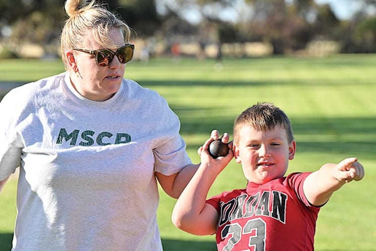 LITTLE ATHLETICS... Zoe Jeffries helps son Charlie with the shot-put.