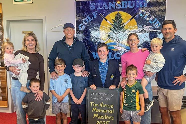 TIM VINCE MEMORIAL MASTERS... Winner Eddie Player (fifth right) with members of Tim Vince’s family: Elsie Thiselton, Serena Vince, Rex Thiselton, Archie Moss, Bernie Vince, Harvey Vince, Eddie, Nate Moss, Elle Moss, Hudson Moss, James Moss.