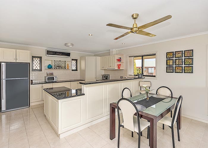 Key features include three large bedrooms, all fitted with ceiling fans, and the master bedroom boasts an ensuite and walk-in robe.